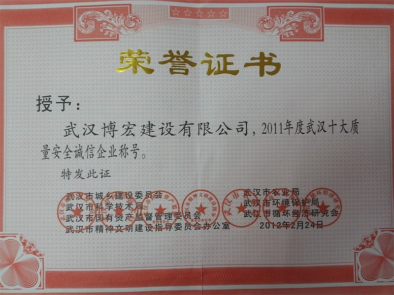 2011年度武漢十大質(zhì)量安全誠(chéng)信企業(yè)稱號(hào)