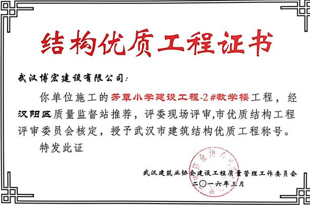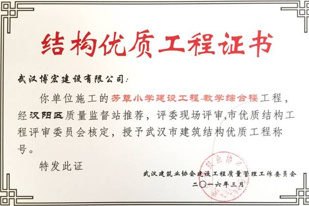 我單位施工的芳草小學(xué)建設(shè)工程(芳草路與四新北路交匯處西北角)1#教學(xué)樓、2#教學(xué)樓、教學(xué)綜合樓工程,經(jīng)漢陽區(qū)建筑管理站推薦,評(píng)委現(xiàn)場評(píng)審,武漢建筑業(yè)協(xié)會(huì)建設(shè)工程質(zhì)量管理工作委員會(huì)核定,授予武漢市建筑結(jié)構(gòu)優(yōu)質(zhì)工程稱號(hào)。