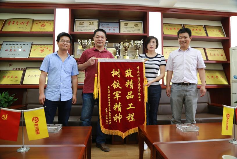 努力成就未來,精品贏得榮譽!6月14日,因金龍公館4-7樓裝修改造工程建設(shè)又快又好,漢陽區(qū)食品藥品監(jiān)督管理局辦公室主任馬濤專程到訪博宏建設(shè),送來錦旗一面表示感謝!