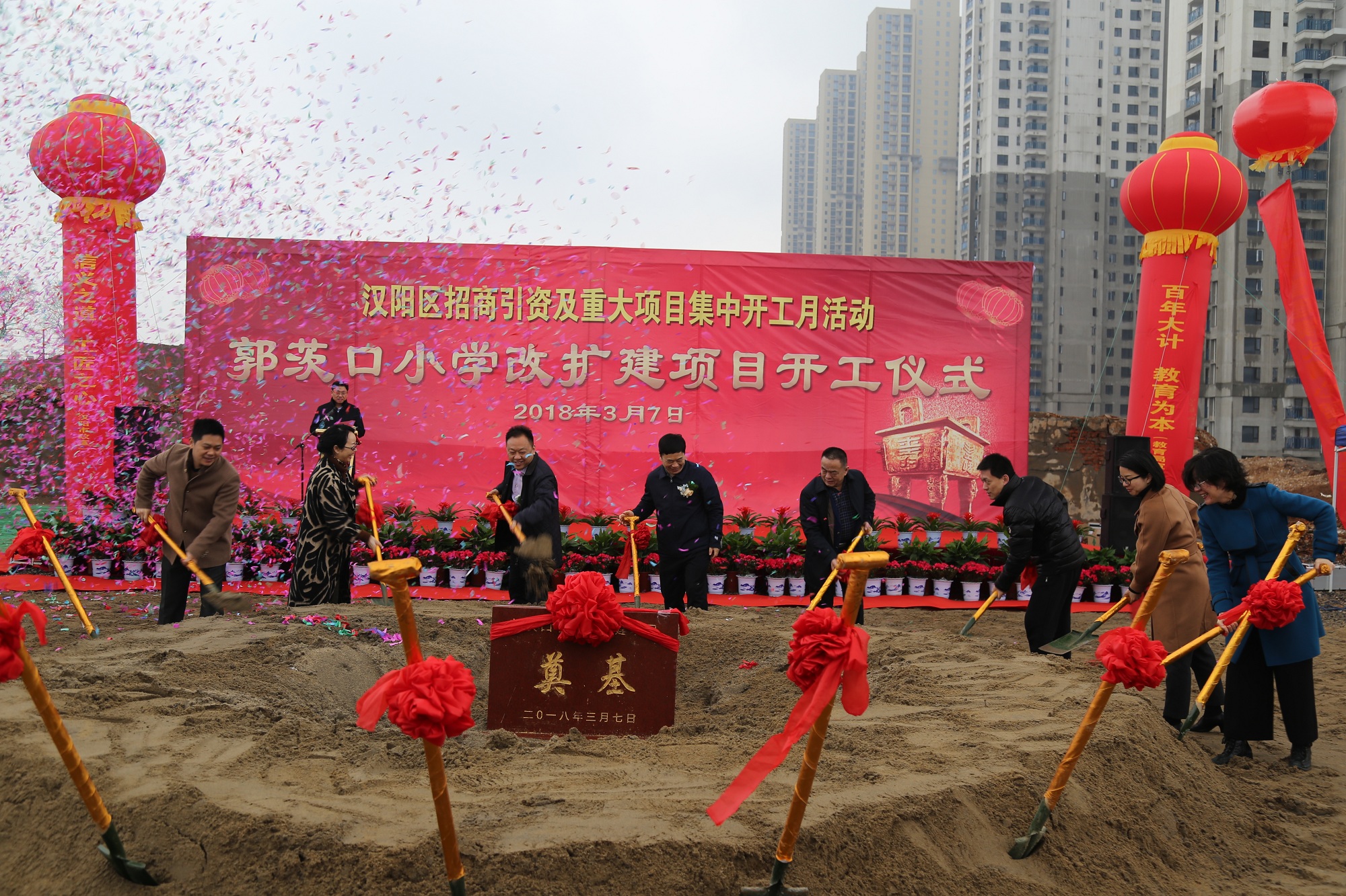 莫道春來(lái)早,更有早行人。2018年3月7日上午,漢陽(yáng)區(qū)招商引資重大項(xiàng)目集中開(kāi)工活動(dòng)走進(jìn)郭茨口小學(xué)改擴(kuò)建項(xiàng)目。漢陽(yáng)區(qū)委書(shū)記馬澤江,區(qū)長(zhǎng)閻磊,區(qū)政協(xié)主席張本滿,區(qū)人大副主任黃學(xué)真,副區(qū)長(zhǎng)蔡松、胡勇、皮惠蘭,區(qū)教育局局長(zhǎng)施慧芳,漢陽(yáng)市政總經(jīng)理虞志鵬、副總經(jīng)理王智高,天創(chuàng)房地產(chǎn)總經(jīng)理張琴,博宏建設(shè)董事長(zhǎng)錢濤等蒞臨開(kāi)工儀式現(xiàn)場(chǎng)。