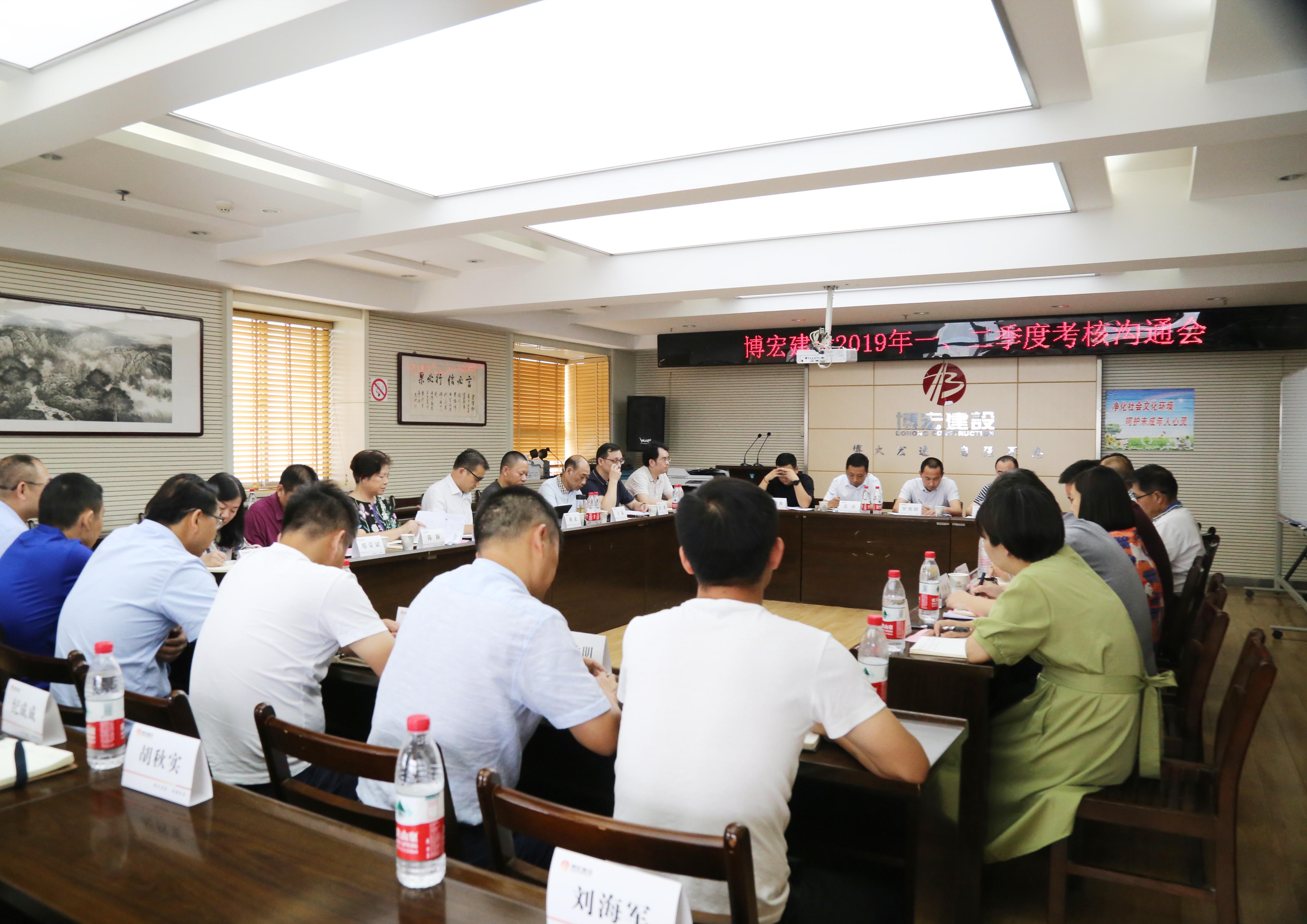 ?????????? 7月9日下午2:30,公司2019年一、二季度考核溝通會順利召開,會議就博宏建設上半年考核工作目標完成情況進行了分析和交流,并就下半年工作思路進行進一步明確。漢陽市政集團公司黨委班子、各科室負責人、博宏建設支部班子、各部門負責人、項目經(jīng)理及技術(shù)負責人共計40余人參加了此次會議。