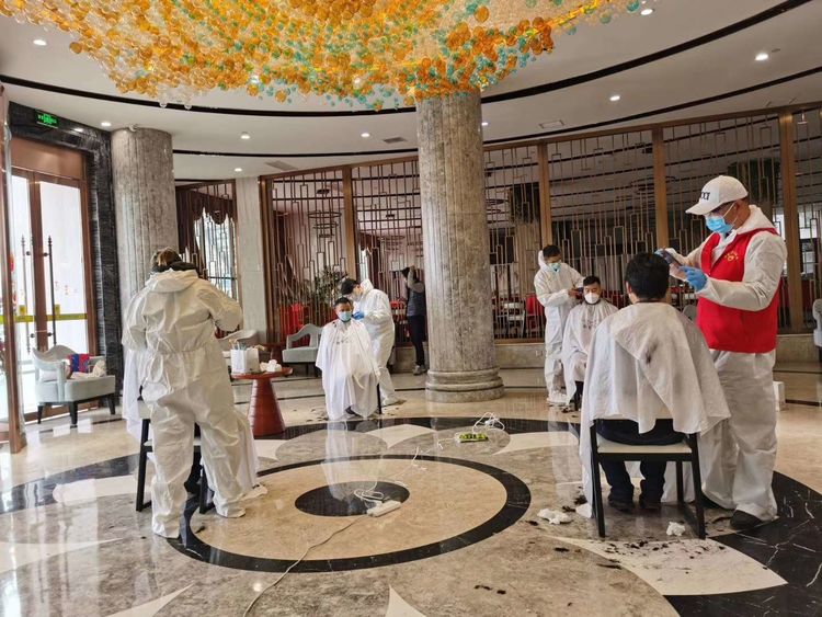 目前正值疫情防控決戰(zhàn)階段,為了確保整個理發(fā)過程安全有序,此次理發(fā)活動選在公司防疫項(xiàng)目建設(shè)人員集中居住的紐賓凱大酒店,志愿者們均由公司指派專人開車提前1個小時從漢陽、漢口接至酒店,進(jìn)入大堂之前,所有人員均進(jìn)行了體溫檢測,并分發(fā)口罩,理發(fā)開始后則按照每四人一組進(jìn)行輪換理發(fā),避免人員集中。整個理發(fā)過程持續(xù)了近4個小時,在4位理發(fā)師的精心打理下,70余名項(xiàng)目一線人員從“油膩大叔”秒變“帥氣小伙”。