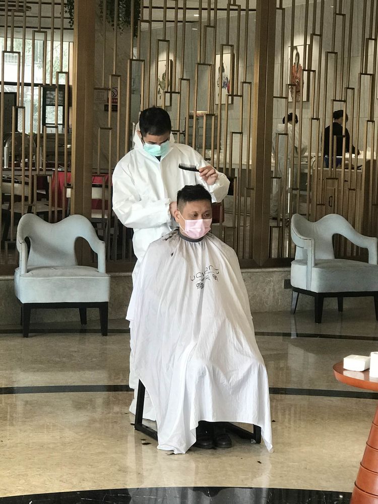 “麻煩幫我剪短點(diǎn),再剪短點(diǎn),兩個月沒理過發(fā)了,頭發(fā)從來沒這么長過!”3月8日上午10點(diǎn),搬來幾張椅子、拿上幾把剪發(fā)器,“臨時理發(fā)店”在紐賓凱酒店大堂正式開業(yè)。