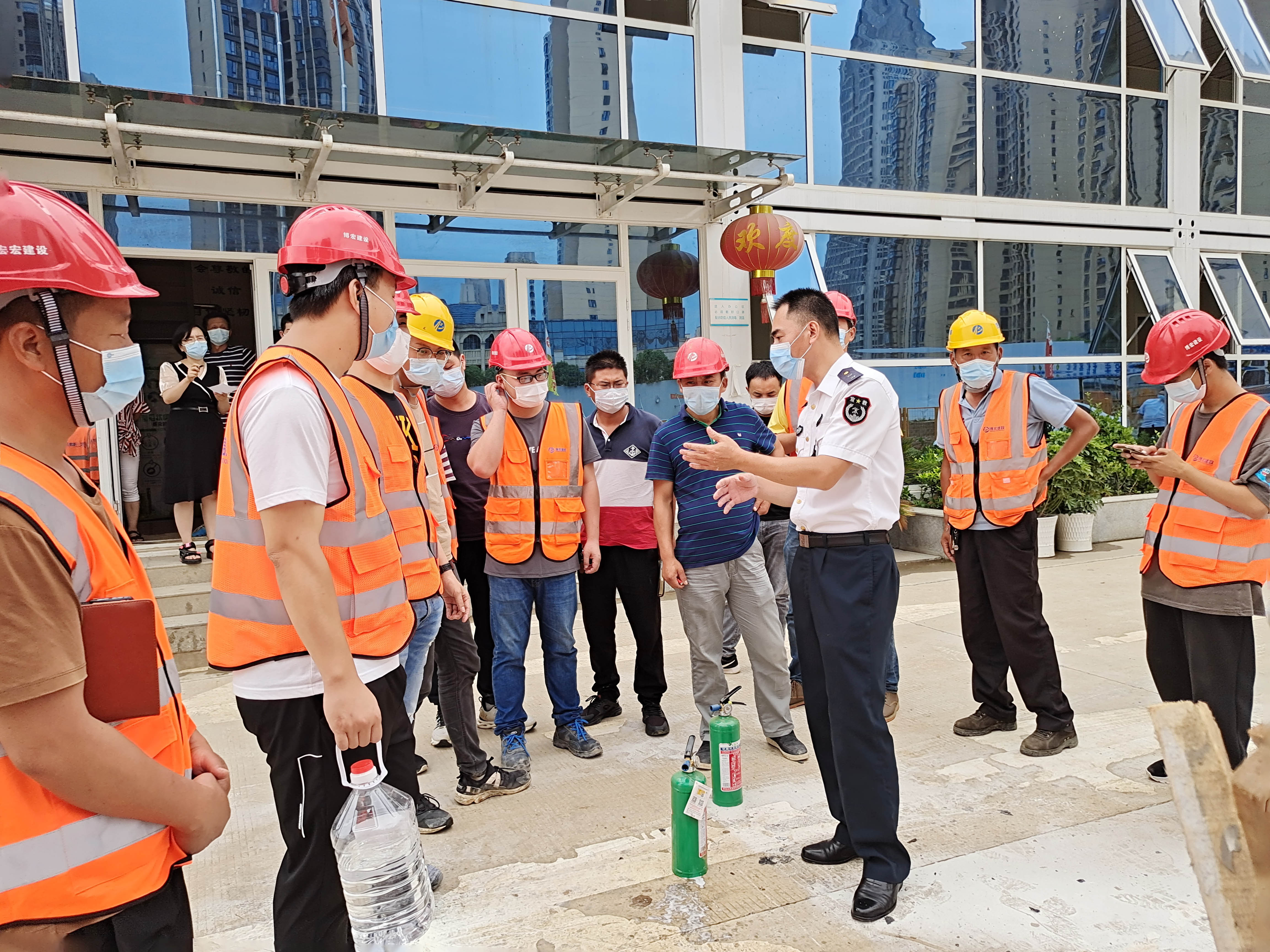 演練中,公司邀請到湖北省楚安防火宣教中心謝小秋教官來到項(xiàng)目現(xiàn)場進(jìn)行了消防安全知識(shí)講解。期間,重點(diǎn)介紹了各類滅火器的使用方法和適用場景,并現(xiàn)場進(jìn)行了演示。
