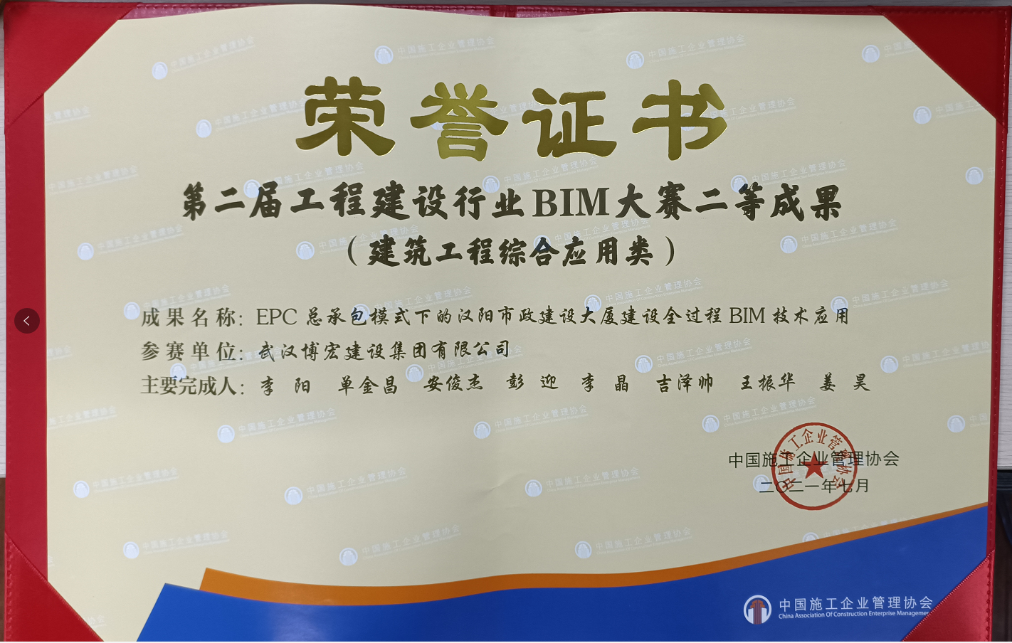 10月8日,博宏建設(shè)捧回“第二屆”全國工程行業(yè)BIM大賽獎杯,此次BIM大賽為全國性性質(zhì)比賽,由中國施工企業(yè)管理協(xié)會主辦,公司參賽作品“EPC總承包模式下的漢陽市政建設(shè)大廈建設(shè)全過程BIM技術(shù)應(yīng)用”在2275個作品中脫穎,獲得二等獎的優(yōu)異成績。