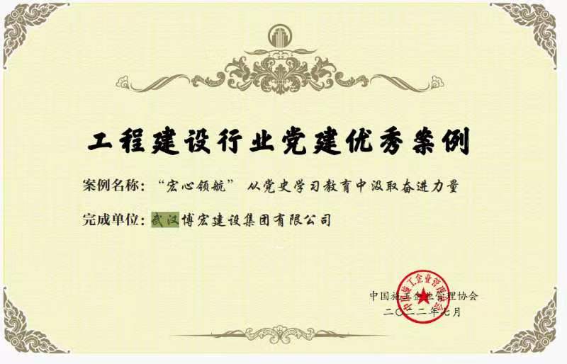 近日,中國施工企業(yè)管理協(xié)會(huì)發(fā)布文件,公布了工程建設(shè)企業(yè)黨建工作最佳案例、優(yōu)秀案例,由博宏建設(shè)集團(tuán)申報(bào)的““宏心領(lǐng)航”,從黨史學(xué)習(xí)教育中汲取奮進(jìn)力量”獲優(yōu)秀案例榮譽(yù)。
