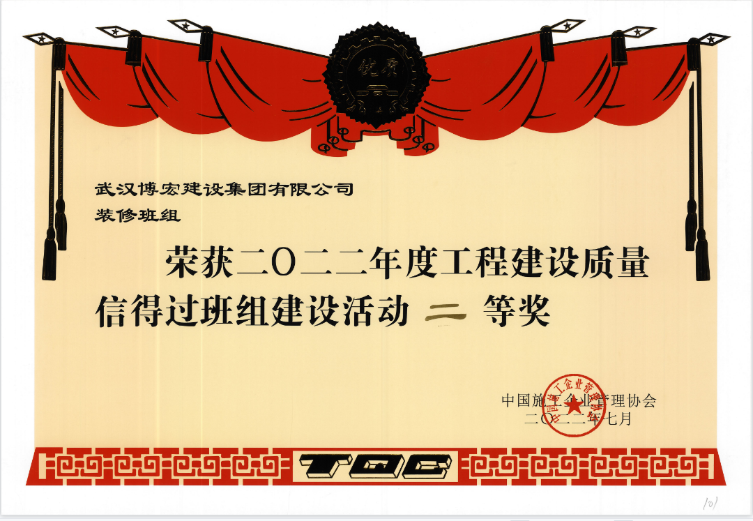 近日,博宏建設(shè)集團(tuán)裝修分公司榮獲中國施工企業(yè)管理協(xié)會頒發(fā)的2022年度工程建設(shè)質(zhì)量“信得過班組”建設(shè)活動(dòng)“二等獎(jiǎng)”以品質(zhì)工程,打造博宏品牌。