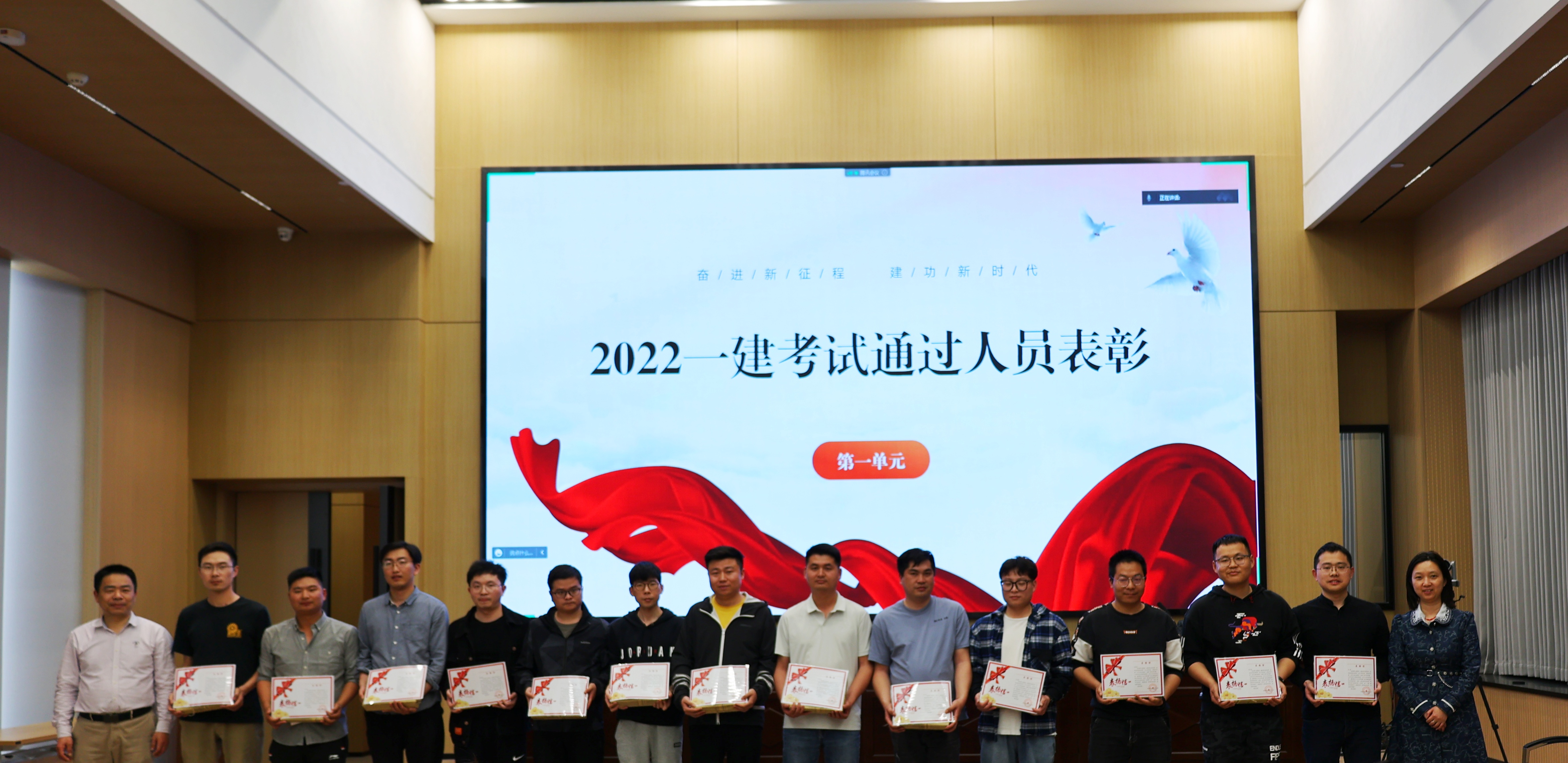 黨委副書記郭一清和本次合作培訓(xùn)機(jī)構(gòu)講師——鑫凌眾教育資深名師甘恢義老師為2022年度16名通過一建考試的學(xué)員頒發(fā)榮譽(yù)獎(jiǎng)品和表揚(yáng)信。