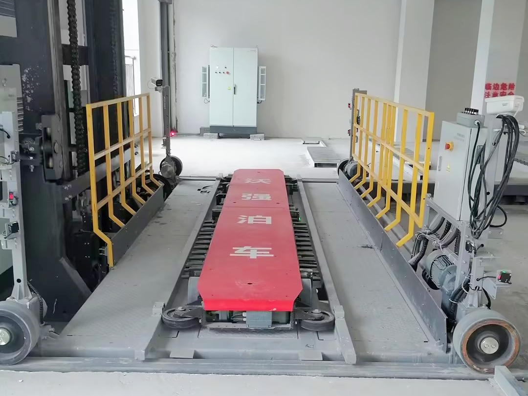 惠民苑社區(qū)服務(wù)中心改造工程EPC項(xiàng)目配備有地上6層的平面移動(dòng)型車庫(kù),共有127個(gè)車位,由轉(zhuǎn)盤、端部升降機(jī)、橫移臺(tái)車和梳齒搬運(yùn)器等設(shè)備組成完整的停車系統(tǒng)。轉(zhuǎn)盤設(shè)置在出入口車廳內(nèi),可實(shí)現(xiàn)汽車的轉(zhuǎn)向功能;端部升降機(jī)設(shè)置在車庫(kù)內(nèi)部巷道的側(cè)邊,可實(shí)現(xiàn)車輛的豎直提升功能;橫移臺(tái)車設(shè)置在升降機(jī)內(nèi),可實(shí)現(xiàn)車輛的橫向搬運(yùn)功能;梳齒搬運(yùn)器設(shè)置在橫移臺(tái)車內(nèi),采用電機(jī)驅(qū)動(dòng)行走輪實(shí)現(xiàn)汽車縱移運(yùn)動(dòng),具有運(yùn)行平穩(wěn)、承載能力強(qiáng)的特點(diǎn);車庫(kù)總控制設(shè)備設(shè)置在一層監(jiān)控室內(nèi),用于所有停車機(jī)電設(shè)備的控制和調(diào)度。