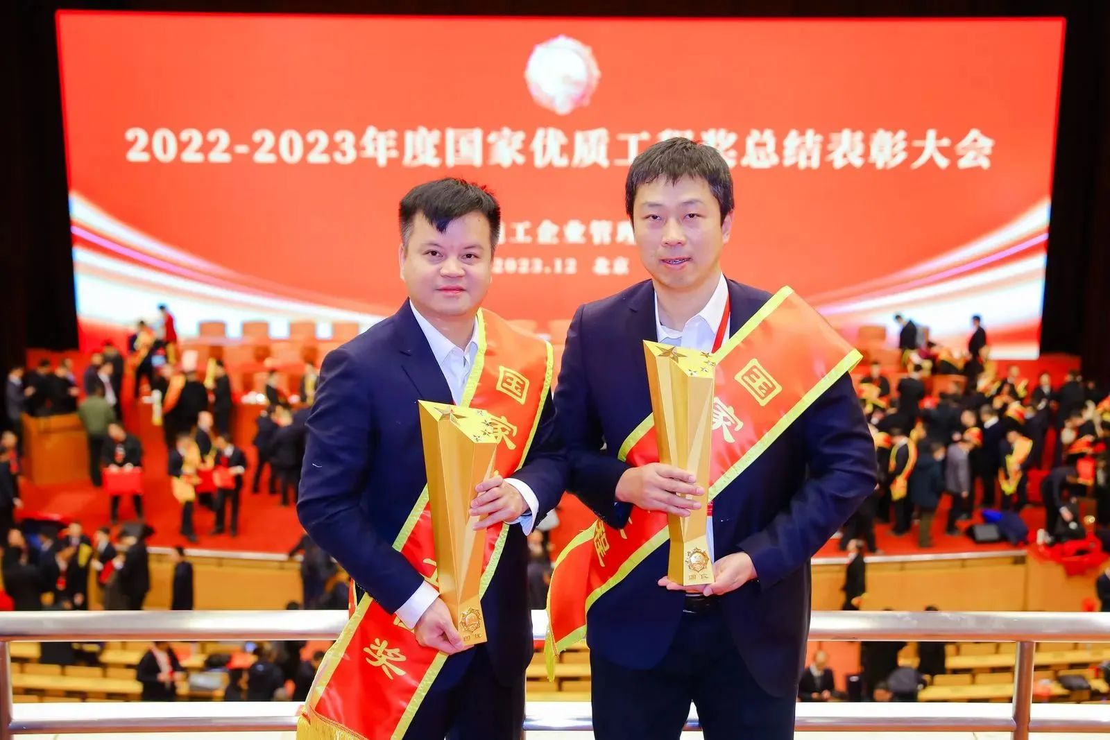 12月24日,2022~2023年度國家優(yōu)質(zhì)工程表彰大會在北京隆重召開,公司總經(jīng)理助理李暉、項(xiàng)目經(jīng)理童威接受頒獎(jiǎng)。博宏建設(shè)集團(tuán)捧回了兩座浸染著汗水與拼搏的榮譽(yù)獎(jiǎng)杯。