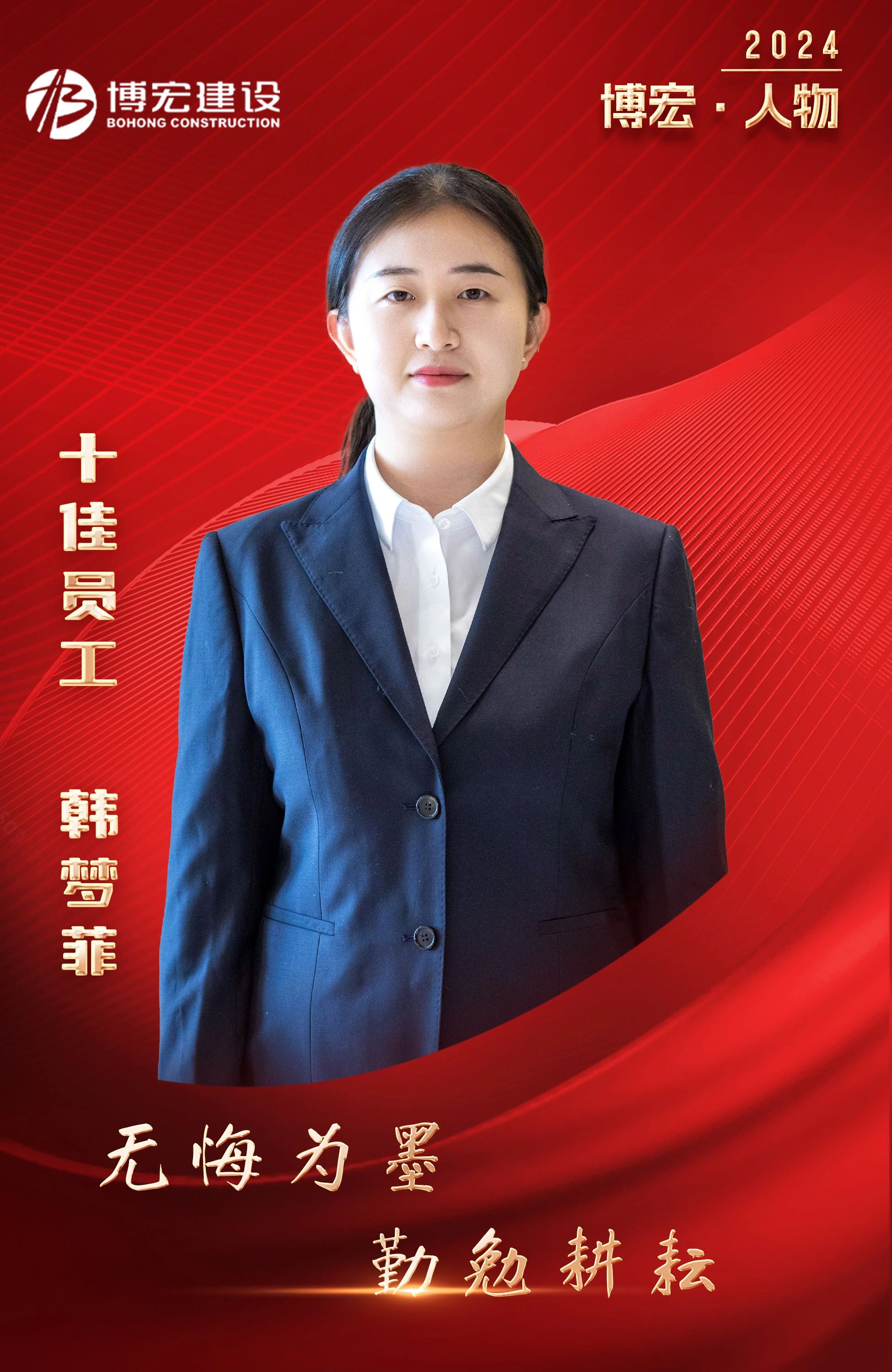 韓夢菲,黨建宣傳崗,入職博宏近2年,主導策劃了多次專題宣傳活動,讓宣傳思想工作更有滲透力、說服力、吸引力,逐步成長成為宣傳思想文化戰(zhàn)線上的骨干,榮獲博宏建設集團2023年度“十佳員工”。從宣傳專員到黨建專員,崗位轉變,但服務業(yè)務部門,為公司賦能的初心不變。